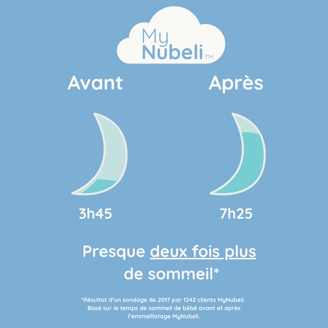 Les bébés emmaillotés avec MyNubeli™ dorment deux fois plus longtemps que ceux enveloppés dans des emmaillotages classiques.